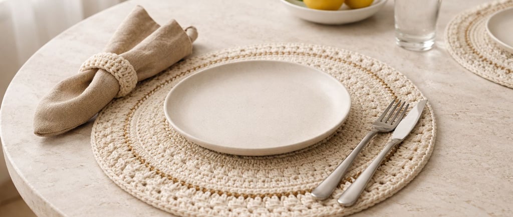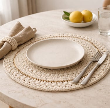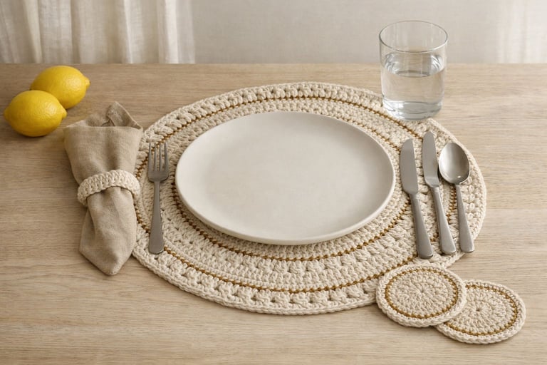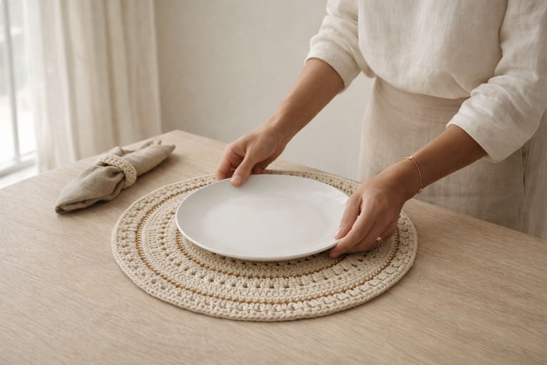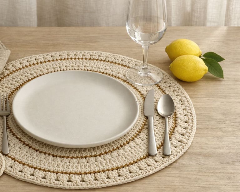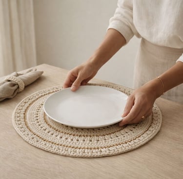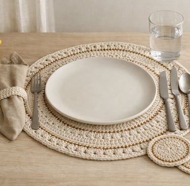 Quando você coloca um sousplat de crochê em algodão natural, com detalhes em dourado, algo muda imediatamente:
